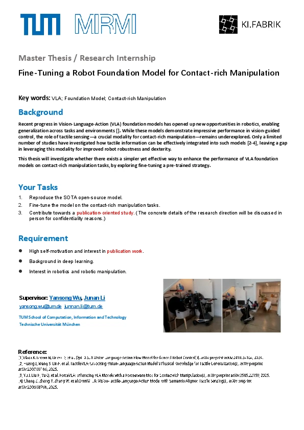 Background: Recent progress in Vision-Language-Action (VLA) foundation models has opened up new opportunities in robotics, enabling generalization across tasks and environments []. While these models demonstrate impressive performance in vision-guided control, the role of tactile sensing—a crucial modality for contact-rich manipulation—remains underexplored. Only a limited number of studies have investigated how tactile information can be effectively integrated into such models [2-4], leaving a gap in leveraging this modality for improved robot robustness and dexterity. This thesis will investigate whether there exists a simpler yet effective way to enhance the performance of VLA foundation models on contact-rich manipulation tasks, by exploring fine-tuning a pre-trained strategy.