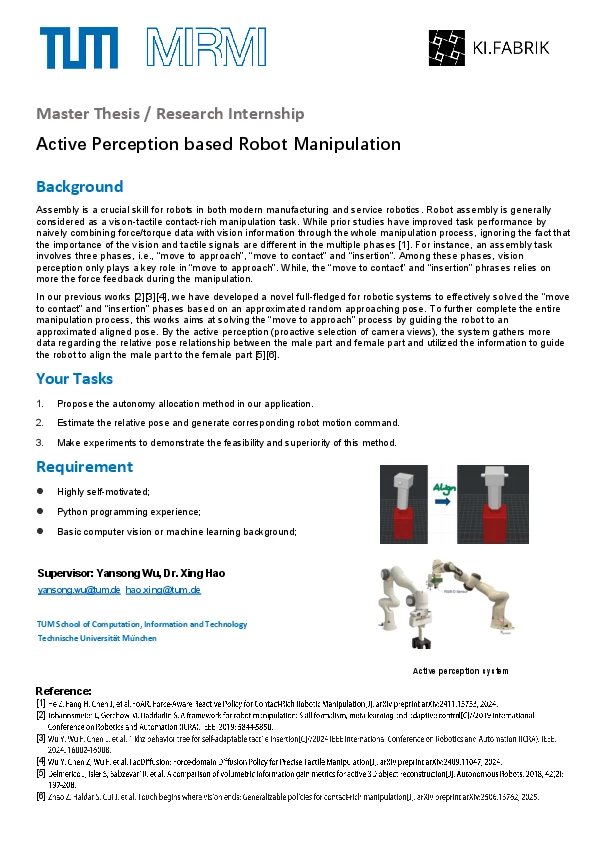 Requirement: ⚫ High self-motivation and interest in publication work. ⚫ Background in deep learning. ⚫ Interest in robotics and robotic manipulation.