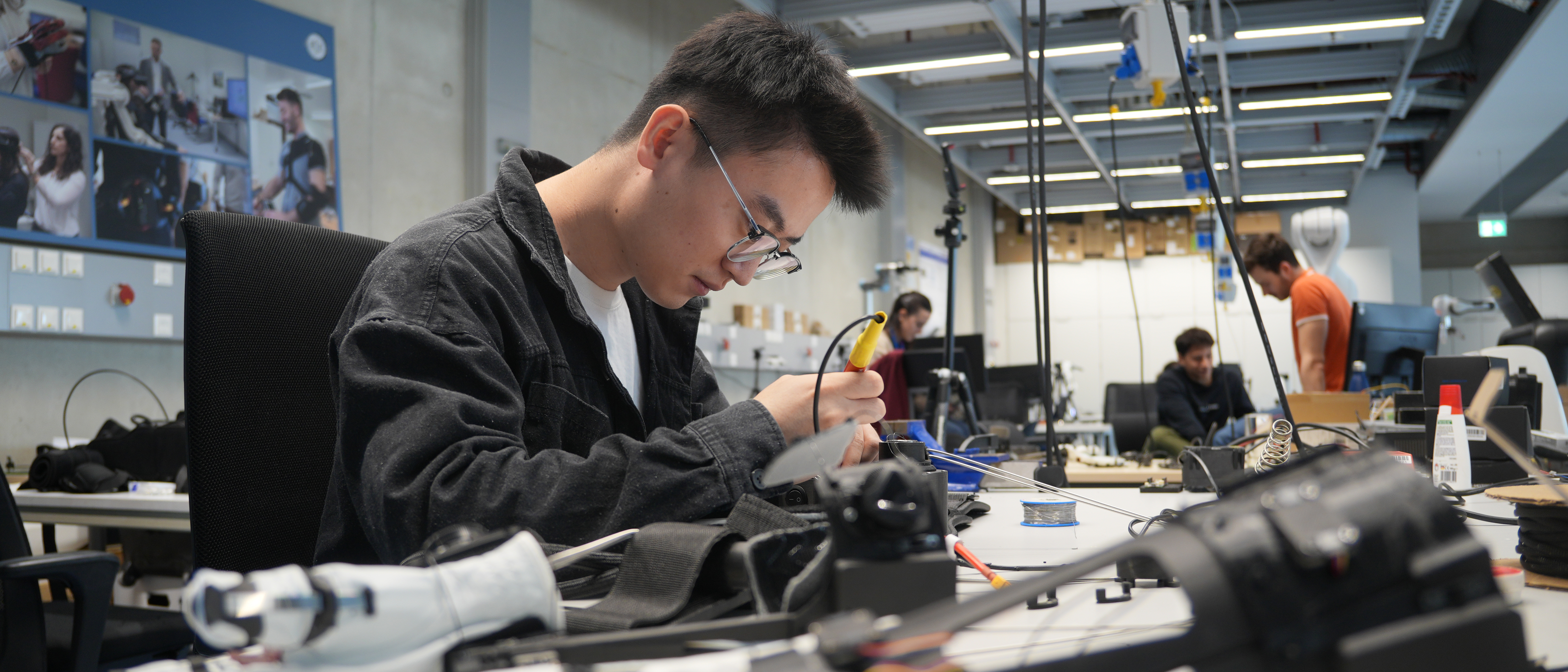 The door to the lab on the ground floor of the Siemens Technology Center closes, a short corridor, then left: at a table, Huimin Su leans over cables and prototypes. Next to him are white gloves with cable drives, a black belt with motors and metal housings. The scene looks like a workshop – and a glimpse into the future.