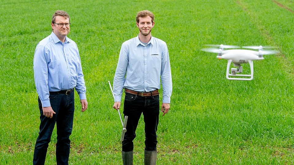 Prof. Heinz Bernhardt, Chair of Agricultural Systems Engineering, and his staff member Andreas Schweiger work on a test field with a drone.