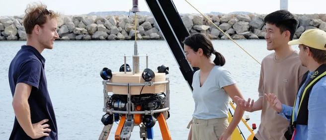 Nicolas Hoischen, Zara Zothabayeva, Tzu-Yuan Huang und Hamish Grant (von links nach rechts) von der TUM diskutieren im Hafen von Marseille über den neuen Tauchroboter der TUM.