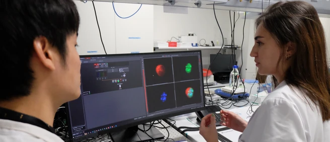 Die Forschenden Chen Wang und Nergishan İyizan (re) aus dem Microrobotic Bioengineering Lab an der Technischen Universität München (TUM) diskutieren den Entwicklungsstatus von Stammzellen.