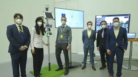 A team led by Prof. Jia Chen, Professorship of Environmental Sensing and Modeling, developed an intelligent sensor system for environmental monitoring. The purpose of this demo was to show how future mobile sensors on the drone can serve the purpose of calibrating the sensor values and interpolating the concentration maps in the city using machine learning algorithms. For this, one sensor node was in Dürnast and a second was at Die Neue Sammlung - The Design Museum, in Munich. The sensor system measured nitrogen oxides, fine dust, temperature, and humidity every second. The values were transmitted in real-time and displayed at the museum. The sensor system is innovative and smart in terms of energy management and drift compensation. This autumn, they will permanently set up 50 of these sensor systems to generate a real-time air quality map in Munich. The sensor system shown in this demo is funded by the Bavarian Ministry for the Environment and Consumer Protection.