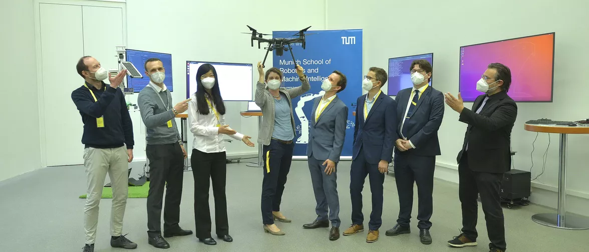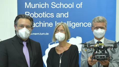In addition to the future of work, health, and mobility, MSRM PIs are researching future-oriented technologies and their applications for the future of our environment. To this end, Prof. Jia Chen, Prof. Timo Oksanen, Prof. Sami Haddadin, Prof. Markus Ryll, Prof. Stefan Leutenegger, and their teams showed for the first time a combination of prototypes of how AI and intelligent robots could be used for sustainable agriculture and environmental monitoring at Die Neue Sammlung - The Design Museum in Munich. Their research opens possibilities in the direction of a home office workplace for farmers. State Minister for Science and Art Bernd Sibler, and TUM President Prof. Thomas Hofmann attended the demonstration.