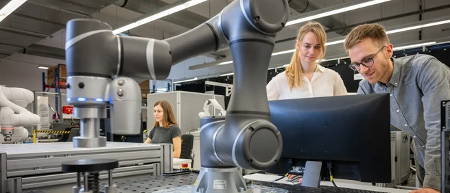 Im AI Robot Safety & Performance Center von TUM MIRMI haben die Forschenden Alessandro Melone, Robin Kirschner (Mitte) und Kübra Karacan (hinten) über Jahre die Feinfühligkeit von Robotik-Manipulatoren analysiert.