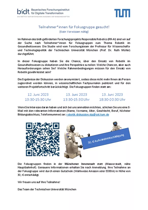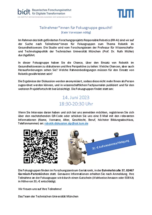 Wir freuen uns, die Organisation einer aufregenden Reihe von Fokusgruppen in München und Garmisch-Partenkirchen bekannt zu geben, die darauf abzielen, die breite Öffentlichkeit in Diskussionen über verantwortungsvolle Robotik und die transformative Wirkung von Robotik im Gesundheitswesen einzubeziehen. Es sind keine besonderen Vorkenntnisse erforderlich, und Teilnehmer aus allen Bereichen sind herzlich willkommen. Die Fokusgruppen finden am 12., 13. und 14. Juni in München und Garmisch-Partenkirchen statt. Interessierte Personen werden ermutigt, sich unter Meeting-Registrierung - Zoom anzumelden oder uns eine E-Mail mit den relevanten Informationen (Nachname, Vorname, Alter, Geschlecht, Beruf, höchster Bildungsabschluss, Telefonnummer) an robotik.diskussion.stp(at)sot.tum.de zu senden. Wir wären Ihnen dankbar, wenn Sie diese Einladung auch an Kollegen, Freunde oder Bekannte weitergeben würden, die ebenfalls Interesse an einer Teilnahme haben könnten. Die Fokusgruppe steht Personen aus verschiedenen Hintergründen offen, und wir sind überzeugt, dass eine Vielzahl von Perspektiven unsere Diskussionen bereichern wird. Als Dankeschön erhalten die Teilnehmer einen Gutschein in Höhe von 30 € für ihre Teilnahme.
